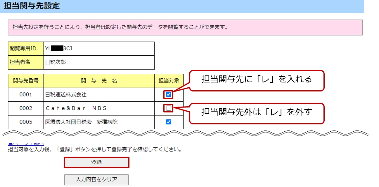 [担当関与先設定]画面で担当する関与先の[担当対象]欄のチェックボックスにチェック「レ」を入れます。担当する関与先から除外する場合は、チェックボックスからチェック「レ」を外します。[登録]ボタンをクリックします。