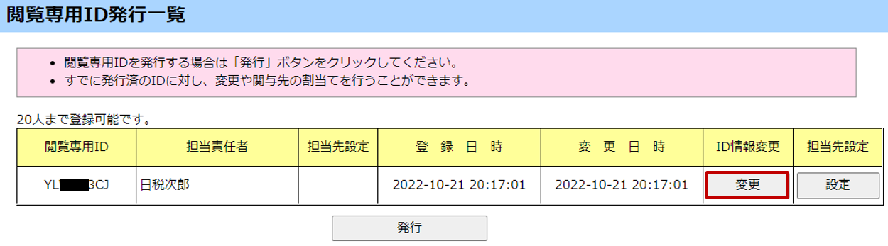 [閲覧専用ID発行一覧]画面で[ID情報変更]欄の[変更]ボタンをクリックします。