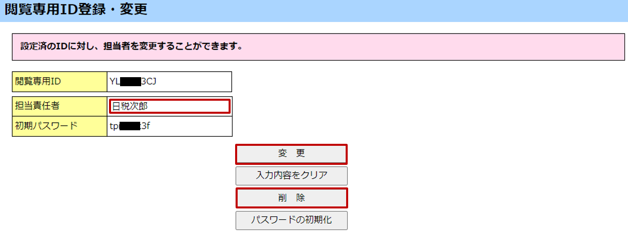[閲覧専用ID登録・変更]画面で、担当責任者を変更する場合は[担当責任者]欄に「新たな担当責任者名」を全角で入力し、[変更]ボタンをクリックします。閲覧専用IDを削除する場合は、[削除]ボタンをクリックします。