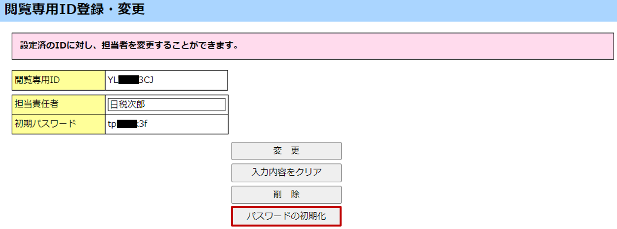 [閲覧専用ID登録・変更]画面で、[パスワードの初期化]ボタンをクリックすることで、初期パスワードに戻すことができます。