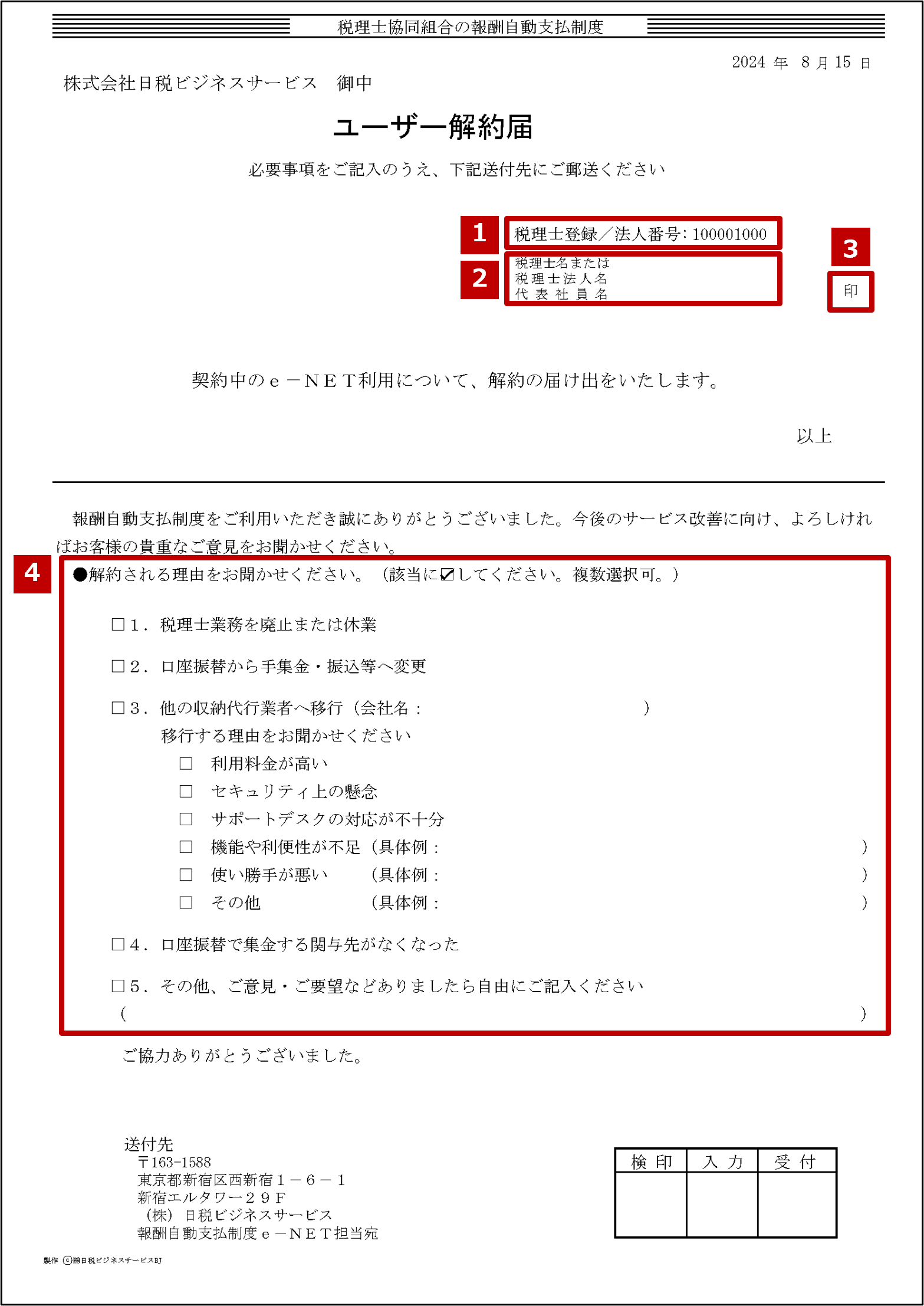 | 解約理由 | 1~5の中で当てはまる解約理由のチェックボックスに、チェック「レ」をご記入ください。(複数選択可) |