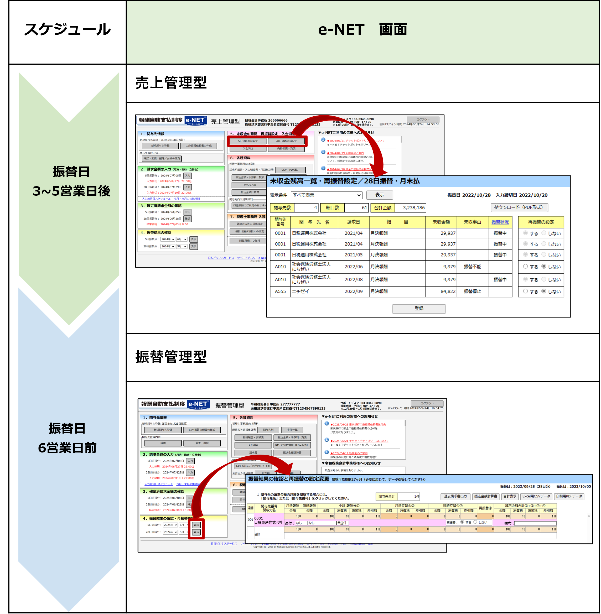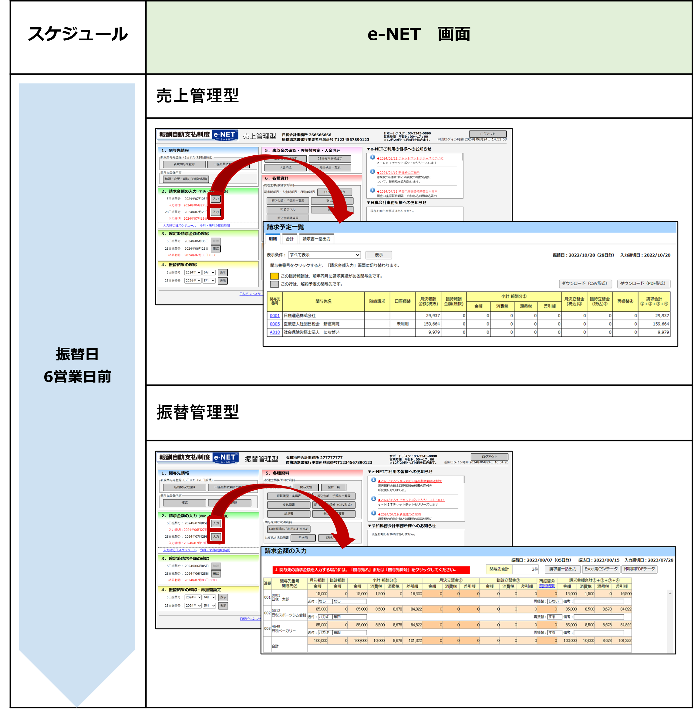 詳細はe-NET 売上管理型 12章 未収金の確認・再振替設定・入金消込を参照してください。