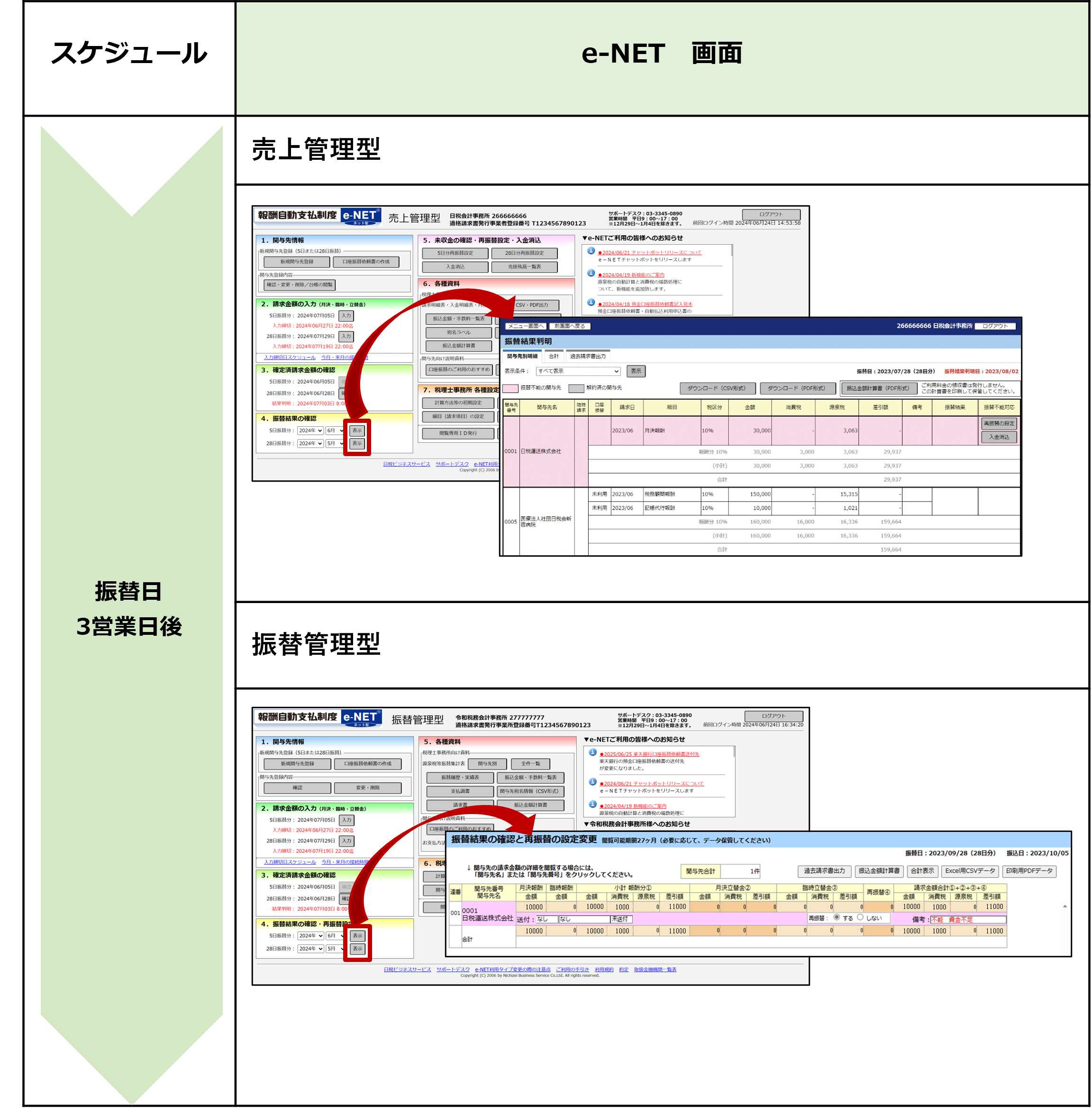詳細はe-NET 売上管理型 11章 振替結果の確認を参照してください。