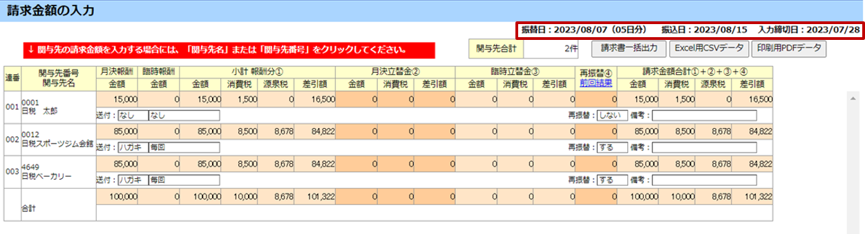 振替日・振込日・入金締切日の確認方法について説明します。 売上管理型の場合は、「振替日」「入力締切日」、振替管理型の場合は、「振替日」「振込日」「入力締切日」が画面右上に表示されます。