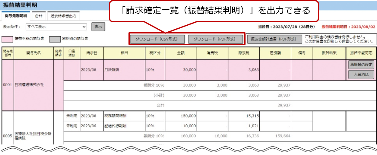 毎月の振替結果判明時に請求データごとに作られるデータです。
